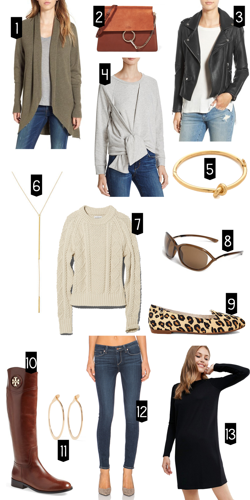 1. Leith Shawl Collar Cocoon Cardigan 2. Chloé – Faye Medium Leather And Suede Shoulder Bag – Brown 3. BLANKNYC ‘Easy Rider’ Faux Leather Moto Jacket 4. FRENCH CONNECTION Fast Hitch Sweatshirt 5. Kate Spade New York Sailor’s Knot Bangle Bracelet 6. Jennifer Zeuner Paloma 18k Gold Vermeil Lariat Necklace 7. Signature Cotton Fisherman Sweater 8. Tom Ford ‘Jennifer’ 61mm Polarized Sunglasses 9. UGG® Blyss Leopard Print Flats 10. Tory Burch ‘Ashlynn’ Riding Boot (Women) (Nordstrom Exclusive) 11. Melissa Joy Manning – 14-karat Gold Hoop Earrings 12. Verdugo Ankle Skinny 13. ASOS Shift Dress in Ponte with Long Sleeves