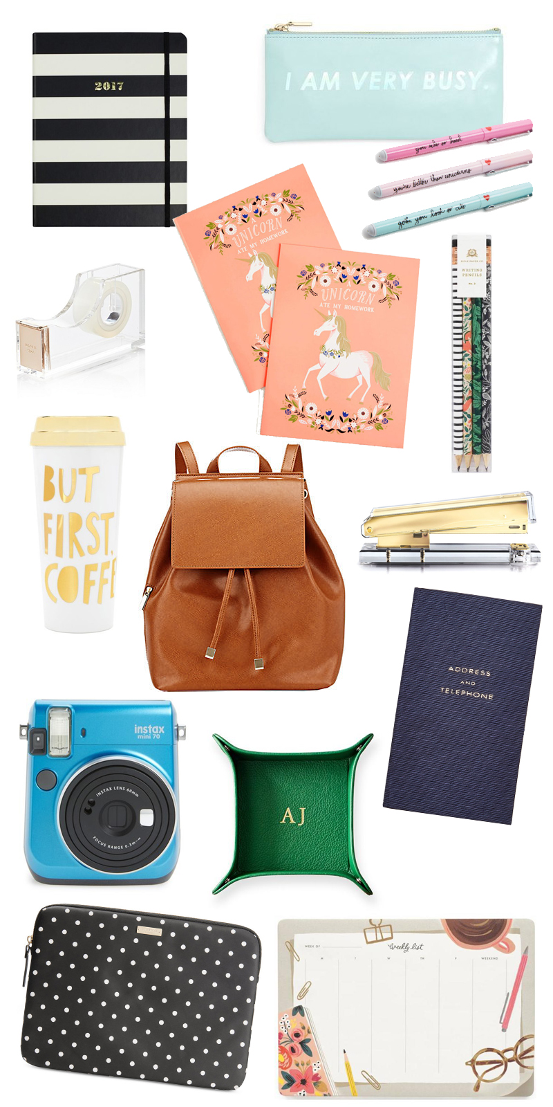 Black and White Agenda: Kate Spade New York Large 17-Month Agenda Pencil Pouch: BAN.DO ‘I Am Very Busy’ Pencil Pouch Pens: ban.do Sweet Talk Pen Set Tape Dispenser: kate spade new york Acrylic Tape Dispenser Unicorn Folders: The Neighs Have It Folder Set Pencils: Rifle Paper Company Folk Writing Pencils Travel Mug: BAN.DO ‘Hot Stuff’ Thermal Travel Mug Backpack: Barneys New York BARNEYS NEW YORK WOMEN’S INDIA MINI BACKPACK-BROWN SIZE OS Stapler: russell + hazel Acrylic Stapler, Gold Camera: Fujifilm ‘instax ® mini 70’ Instant Camera Catchall: Classic Leather Catchall Address Book: Smythson Panama Address and Telephone Book Laptop Sleeve: kate spade new york Mini Pavillion Dot 13″ Laptop Case Sleeve Desktop Calendar: Rifle Paper Company Desktop Weekly Pad